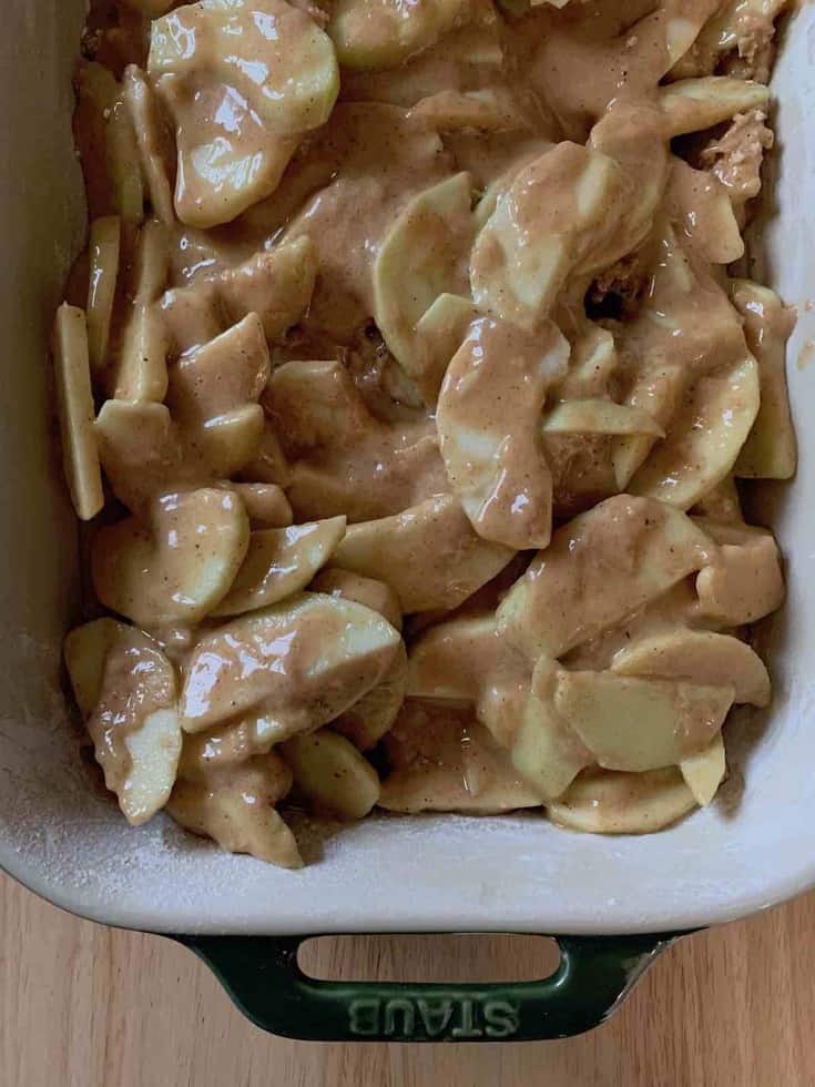 - Add dry ingredients to the apple mixture and blend in and coat the apples evenly as possible. The consistency of the batter will be gooey.