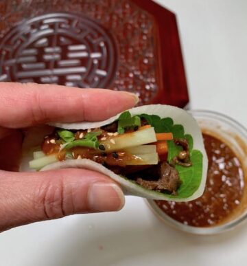 Wrapper - Korean radish - instead of the traditional crepe made with wheat flour, we love using Korean radish, mu. It's low carb and Paleo friendly. Thinly slicing the radish with a knife might be a bit challenging so use a mandolin to slice across the radish in thin slices. If there's a Korean grocery store near you, you can buy packaged pre-sliced radish slices.